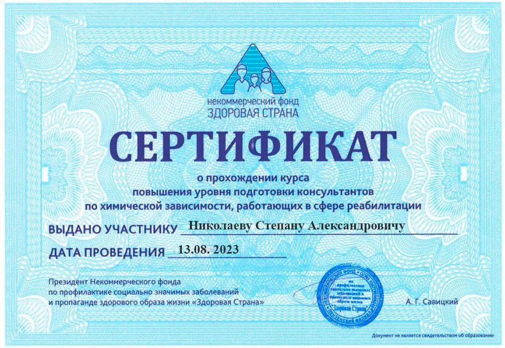 • 2023 — Некоммерческий фонд «Здоровая страна» (курс подготовки консультантов по химической зависимости, работающих в сфере реабилитации)